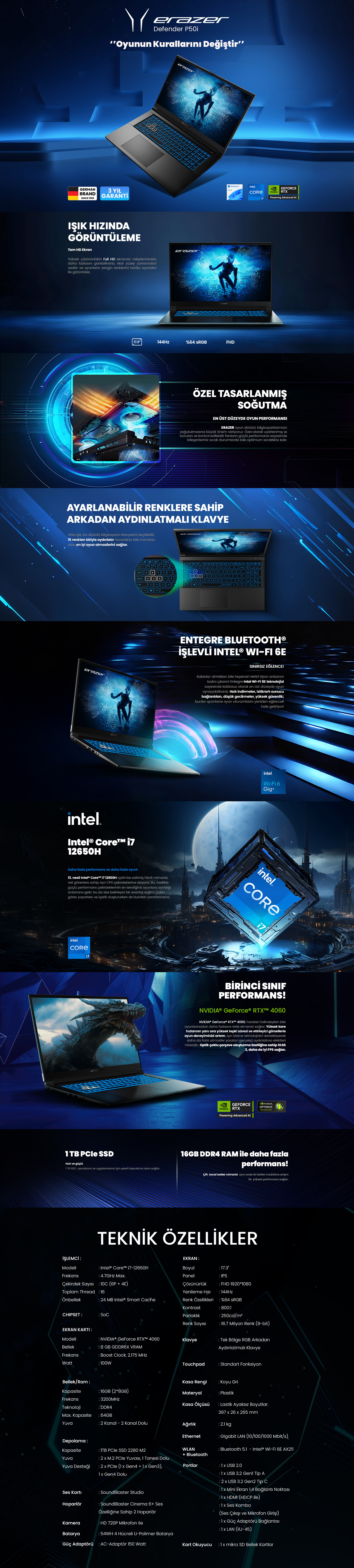ERAZER Defender P50i MD62643, güçlü donanımı ve geniş ekranı ile oyunculara üst düzey bir deneyim sunuyor. Intel Core i7-12650H işlemcisi, 16GB RAM ve 1TB SSD depolamasıyla hem yüksek performans hem de hızlı yükleme süreleri sağlar.