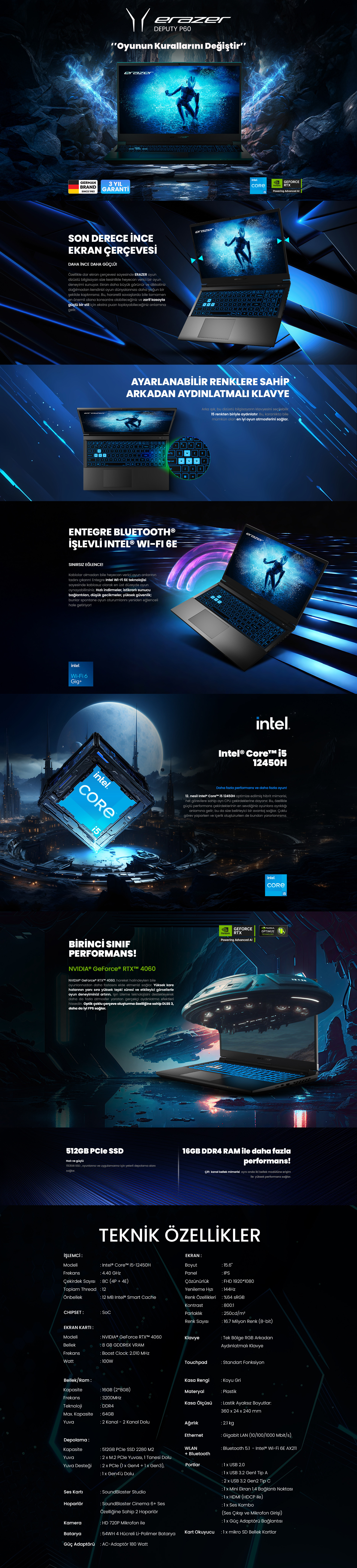 ERAZER Deputy P60 MD62594, güçlü performansı ve modern tasarımıyla oyuncular için özel olarak geliştirildi. Intel Core i5-12450H işlemcisi, 16GB RAM ve 512GB SSD ile oyunlarda ve günlük kullanımda hızlı ve akıcı bir deneyim sunar.